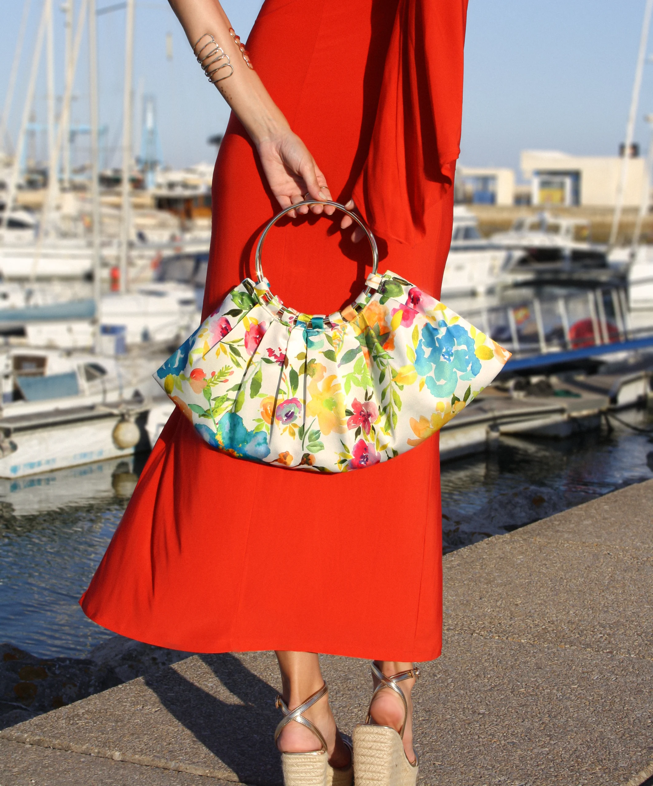 El tejido en satén con tablas y un estampado floral de colores vivos lo convierte en el centro de atención en cualquier evento especial. Su diseño distintivo y vibrante resalta la belleza y el dinamismo de la cultura andaluza, mientras que su tamaño generoso lo hace ideal para llevar todos tus esenciales con estilo.