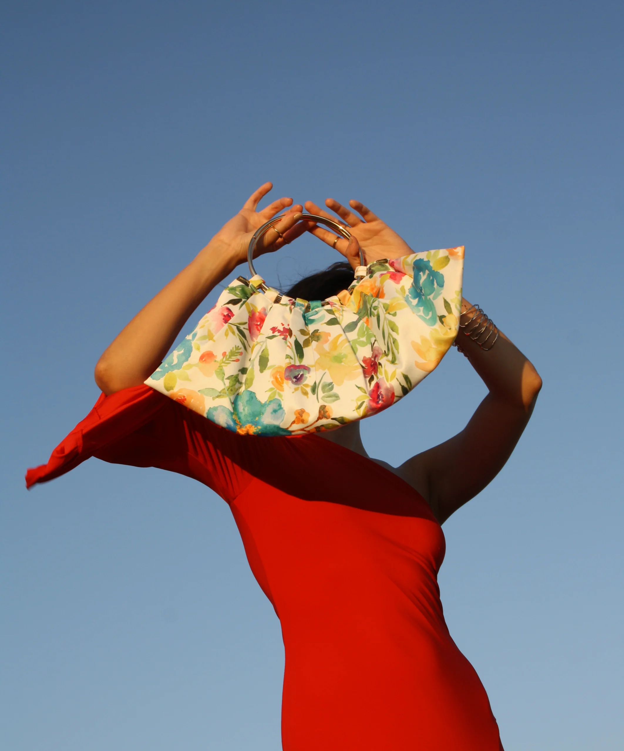 Bolso abanico de Dlaire Spain, hecho a mano en satén con tablas y un vibrante estampado floral. Su diseño vanguardista, inspirado en los abanicos andaluces, y el asa metálica dorada lo convierten en una pieza única y sofisticada. Perfecto para destacar en cualquier evento especial. Unidades muy limitadas.